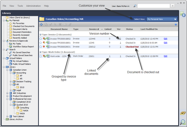 FileHold works much like a filing cabinet with drawers and folders – only it’s in electronic form. It includes the following standard features (some are indicated in boxes below):